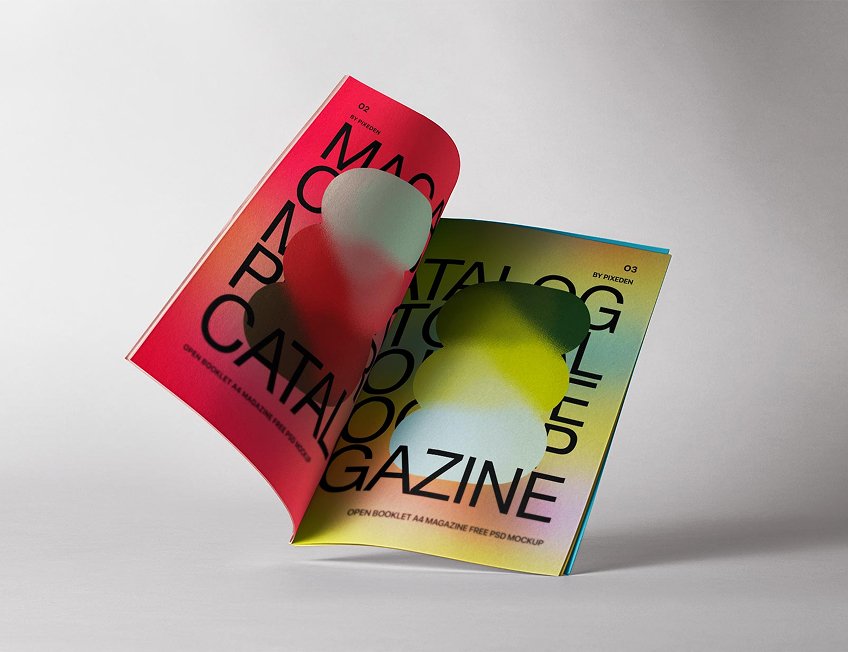 Two open magazine spreads appear to defy gravity, seemingly suspended in mid-air against a clean, off-white background. This deliberate levitation, coupled with a slightly angled perspective, introduces a sense of motion and playfulness that sets this mockup apart. The magazines seem poised for action, as if a gentle breeze might send them fluttering across the screen. This dynamic composition transcends the static nature of a typical mockup, drawing the viewer in and inviting closer inspection.